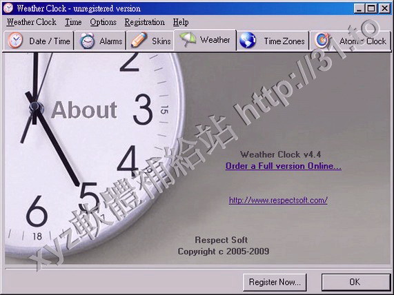 • Respect Soft Weather Clock v3.4 英文正式版(顯示時間日期和所在地的溫度和氣象,提示提供鬧鐘功能的軟體)